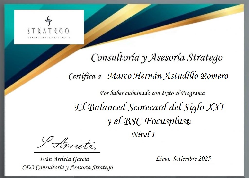 El Programa cuenta con la Certificación de Consultoría y Asesoría Stratego, propietaria de la marca BSC Focusplus®, debidamente registrada ante Indecopi.